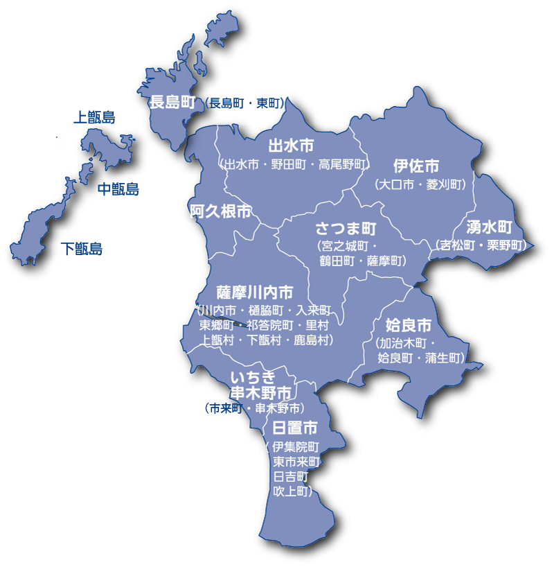 阿久根市、出水市、薩摩川内市、日置市、いちき串木野市、伊佐市、姶良市、さつま町、長島町、湧水町